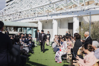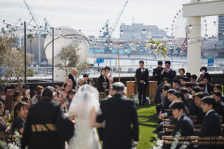 屋外での挙式は、ゲストとの距離がぐっと近くなるのも特徴。
