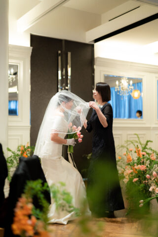 お母様よりベールダウンセレモニー、その後は3人でバージンロードを歩みます。